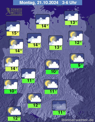 In der Nacht zum Montag ziehen vor allem im Nordwesten, im weiteren Verlauf auch im Norden und Westen einige, oft dichte Wolken auf, Regen fällt dabei aber kaum. Weiter nach Südosten hin zeigt sich der Himmel dagegen meist locker bis aufgelockert bewölkt und es bleibt komplett trocken. Die Temperatur sinkt auf 15 Grad an der Nordsee und bis 9 Grad im Vogtland.