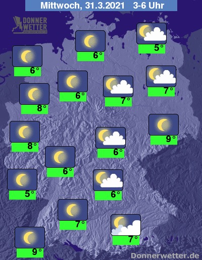 In der folgenden Nacht ist der Himmel sternenklar oder es ist nur locker bewölkt. Es bleibt überall trocken bei Tiefstwerten von 9 Grad in Dresden und etwa 5 Grad in Saarbrücken.