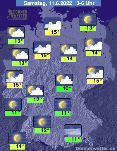 In der kommenden Nacht klingen letzte Schauer im Nordwesten rasch ab, über der übrigen Nordhälfte bleibt es bei teils starker, teils aber auch lockerer Bewölkung trocken. Im Süden ist es überwiegend sternenklar oder es ziehen nur wenige Wolken durch, dazu bleibt es trocken. Die Temperatur sinkt auf 15 Grad in Hamburg und 10 Grad in Jena.