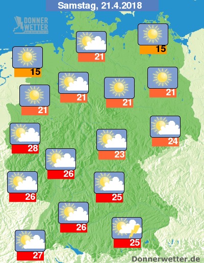Am Samstag erwartet uns wieder verbreitet heiteres bis sonniges Wetter, vor allem im Norden ist es fast nur sonnig, sonst ziehen hier und da nur lockere Wolken durch. Direkt am Alpenrand sind lokale Schauer oder Gewitter möglich, sonst bleibt es hingegen landesweit trocken. Die Temperatur steigt auf frischere 15 Grad entlang der Küsten und bis 28 Grad im Rheinland.