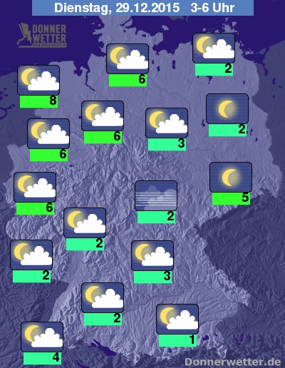In der kommenden Nacht bleibt der Himmel in Ostdeutschland meist sternenklar, sonst ist es verbreitet locker bis aufgelockert bewölkt, dazu bleibt es trocken. Die Temperatur sinkt auf 8 Grad an der Nordsee und bis 1 Grad in München. Über der Landesmitte bildet sich stellenweise Nebel oder Hochnebel. An den deutschen Küsten weht ein teils starker Wind.