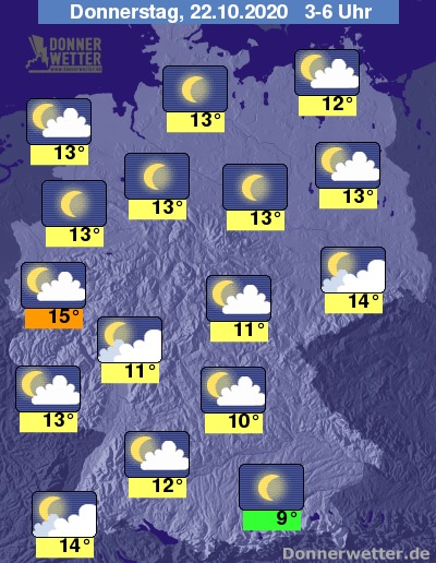 In der Nacht zum Donnerstag ist es über der Nordhälfte der Republik locker bewölkt, oft sogar sternenklar, sonst ist es größtenteils wechselnd bis aufgelockert bewölkt. Am Alpenrand ist der Himmel meist sternenklar. Es bleibt landesweit trocken bei Tiefstwerten von 15 Grad in Bonn und bis 9 Grad in München.