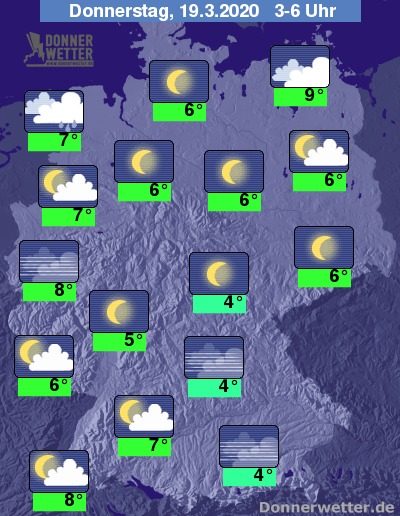 Am Donnerstag ist es im Süden meist heiter bis sonnig, in der breiten Landesmitte überwiegend wechselnd bis stark bewölkt, dabei bleibt es weitgehend trocken. Im Norden ist es verbreitet dicht bewölkt und es fällt auch gebietsweise Regen. Die Temperatur steigt auf 7 Grad im nördlichen Emsland und bis auf frühlingshafte 19 Grad in München.