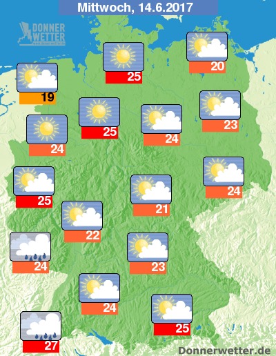 Am Mittwoch bleibt es überwiegend heiter, zum Teil auch sonnig und dabei trocken. Am Alpenrand und im Saarland ziehen jedoch gebietsweise dichte Wolken auf, hier sind einzelne Schauer und auch Gewitter möglich. Die Temperatur erreicht etwa 19 Grad an der Nordsee und bis 27 Grad im Breisgau.