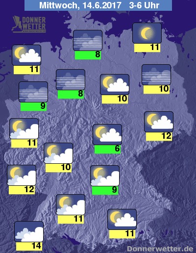 In der kommenden Nacht zeigt sich der Himmel über der Nordosthälfte Deutschlands oft sternenklar und ansonsten nur locker bewölkt. Deutlich mehr, jedoch weitgehend aufgelockerte Wolken ziehen hingegen über den Westen, Südwesten und Süden der Republik hinweg, diese bringen allerdings keinen Regen. Die Temperatur sinkt auf 14 Grad in Freiburg und bis 6 Grad im Thüringer Becken.