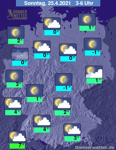 In der folgenden Nacht lockert und klart der Himmel von Norden her immer weiter auf, lediglich im Alpenvorland ist es bis zum Morgen noch oft aufgelockert bis stark bewölkt, es bleibt aber überall trocken. Die Temperatur sinkt auf 7 Grad am Oberrhein und bis -1 Grad am Thüringer Wald.