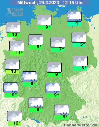 Heute Nachmittag zeigen sich eher selten Auflockerungen, oft ist es stark bis dicht bewölkt. Im Süden fällt zeitweise, sonst nur örtlich etwas Regen. Die Temperatur liegt bei nasskalten 4 Grad an der Müritz und bis 13 Grad im Rheinland.