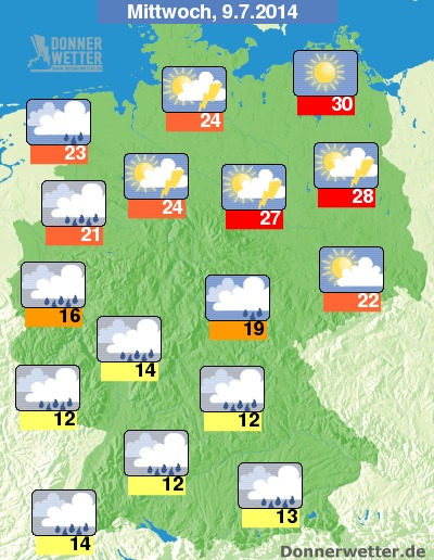 Am Mittwoch erwarten wir eine Zweiteilung beim Wetter, dabei bleibt es in der Nordosthälfte des Landes bei schwülwarmen 22 bis 30 Grad sehr unbeständig mit Schauern und Gewittern, während es im Süden und Westen bei meist dichten Wolken und nur 12 bis 21 Grad sehr regnerisch wird.
