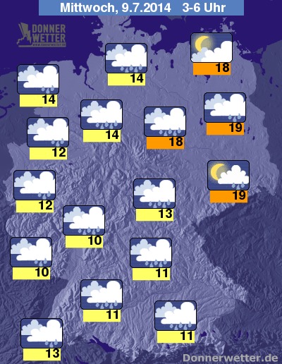 In der Nacht bleibt es am Himmel weitgehend bedeckt und es fällt immer wieder, zum Teil ergiebiger, und im Süden und Osten auch noch gewittriger Regen. Auflockerungen sind dabei am ehesten noch im Ostseeumfeld möglich. Die Temperatur sinkt auf 19 Grad in Berlin und 10 Grad im Pfälzer Wald.