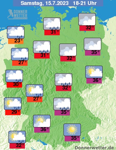 Heute Abend erreichen die ersten Schauer und Gewitter auch die Osthälfte der Republik. Im äußeren Osten ist es aber bei oft noch lockerer Bewölkung weitgehend trocken. Über der Westhälfte ist es teils dicht, teils auch mal aufgelockert bewölkt und es bilden sich vielerorts Schauer, örtlich auch Gewitter. Die Temperatur liegt bei 23 Grad in Bremerhaven und bis 36 Grad in Stuttgart.
