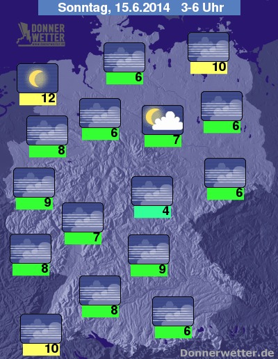 In der kommenden Nacht ist es häufig neblig-trüb, gebietsweise bleibt es aber auch aufgelockert bewölkt. Dazu bleibt es praktisch überall trocken. Die Tiefstwerte erreichen gegen Morgen etwa 12 Grad entlang der Ems und um 4 Grad am Thüringer Wald.