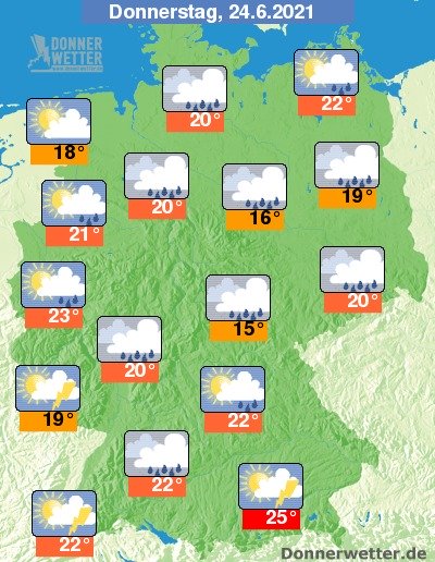 Am Donnerstag ist es im Land überwiegend stark, zum Teil auch aufgelockert bewölkt, dabei bilden sich gebietsweise Schauer. Im Süden und Westen der Republik bilden sich auch lokale Gewitter. Die Temperatur steigt auf 15 Grad in Jena und bis 25 Grad im Raum München.