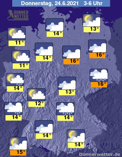 In der Nacht zum Donnerstag ist der Himmel über dem Norden und Westen teils nur locker, teils auch stark bewölkt, dazu bleibt es hier weitgehend trocken. Weiter nach Osten und Süden hin zieht überwiegend dichte Bewölkung durch, dazu können sich einzelne Schauer und vereinzelt auch Gewitter bilden. Die Temperatur sinkt auf 16 Grad in Magdeburg und bis 11 Grad in Emden.