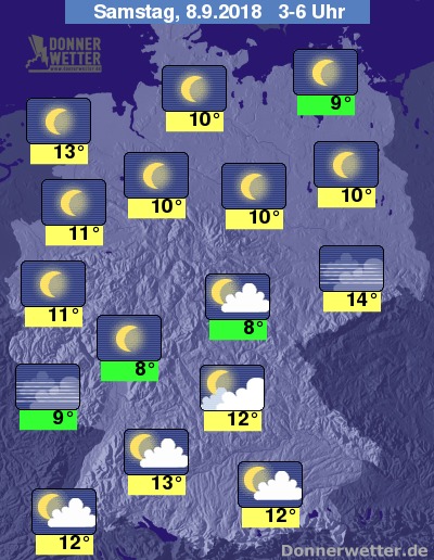 Während der zweiten Nachthälfe funkeln verbreitet die Sterne. Dabei ist der Himmel klar, im Süden auch leicht bewölkt. Stellenweise können sich Nebelfelder bilden. Bis zu den Frühstunden gehen die Temperaturen auf 8 bis 13 Grad zurück. In einigen Mittelgebirgstälern wird es noch etwas kühler.