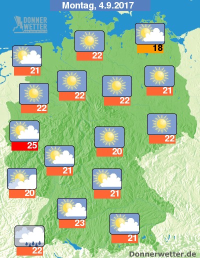 Am Dienstag wird es im Westen wieder wolkiger und am Nachmittag können einige Schauer vorüber ziehen. Sonst scheint nach Nebelauflösung zunächst häufig die Sonne, bevor sich am Nachmittag einige Wolkenfelder bemerkbar machen. Mit Temperaturen zwischen 20 und 25 Grad wird es angenehm warm.