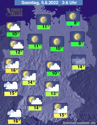 In der Nacht auf Sonntag bleibt der Himmel über dem Norden und Osten des Landes gering bewölkt oder die Sterne funkeln von einem wolkenlosen Himmel. In den südlichen Landesteilen bleibt es bei einem Mix aus lockerer und aufgelockerter Bewölkung weitgehend niederschlagsfrei, einzelne schauerartige Regenfälle und lokale Gewitter beschränken sich auf den Südwesten Deutschlands.
