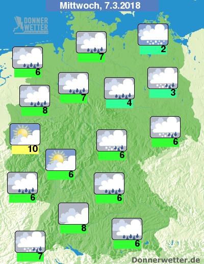 Am Mittwoch hält sich verbreitet starke Bewölkung, dabei fällt zeitweise Regen, im Süden, Osten und Nordosten fällt zum Teil auch Schneeregen oder Schnee. Die besten Chancen für Auflockerungen bestehen im Westen Deutschlands. Die Temperatur steigt auf 2 Grad in Vorpommern und bis 10 Grad in der Kölner Bucht.