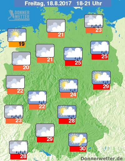 Die Höchstwerte liegen dabei zunächst zwischen 19 Grad an der Nordsee und 30 Grad am Alpenrand, jedoch kühlt es sich im Nachgang der Gewitter rasch ab.