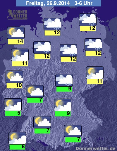 In der Nacht zum Freitag ist es im Norden und Osten weitgehend dicht bewölkt und es fällt gelegentlich Regen oder Sprühregen, in den anderen Landesteilen ist es dagegen meist aufgelockert bewölkt, vor allem im Südwesten auch zeitweise sternenklar, dabei bleibt es trocken. Die Temperatur sinkt auf 14 Grad entlang der Ems und 5 Grad an der Saar.