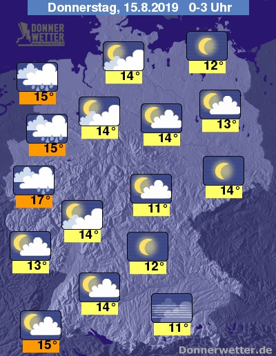 In der Nacht ist der Himmel über der Nordwesthälfte des Landes stark bewölkt oder bedeckt, dabei muss immer wieder mit Schauern gerechnet werden. Zwischen Nordseeküste und dem Münsterland kann es auch kräftiger und anhaltender regnen. In den übrigen Landesteilen überwiegen lockere Wolken, entlang der Oder und im Südosten kann es zeitweise auch aufklaren.
