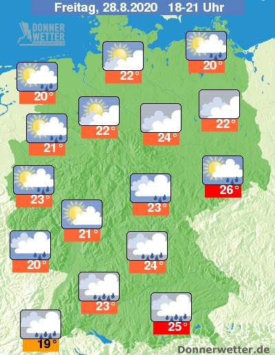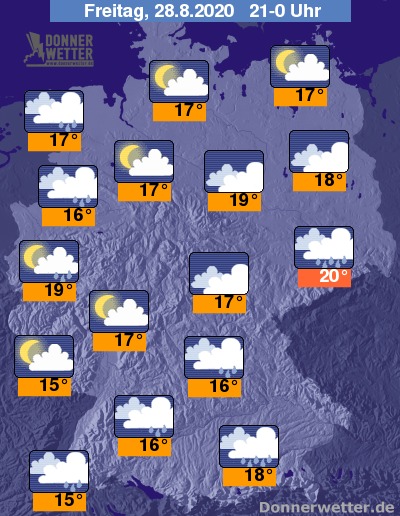 Die Temperaturen gehen bis zum späten Abend auf Werte um 20 Grad in Dresden und um 15 Grad am Hochrhein zurück.