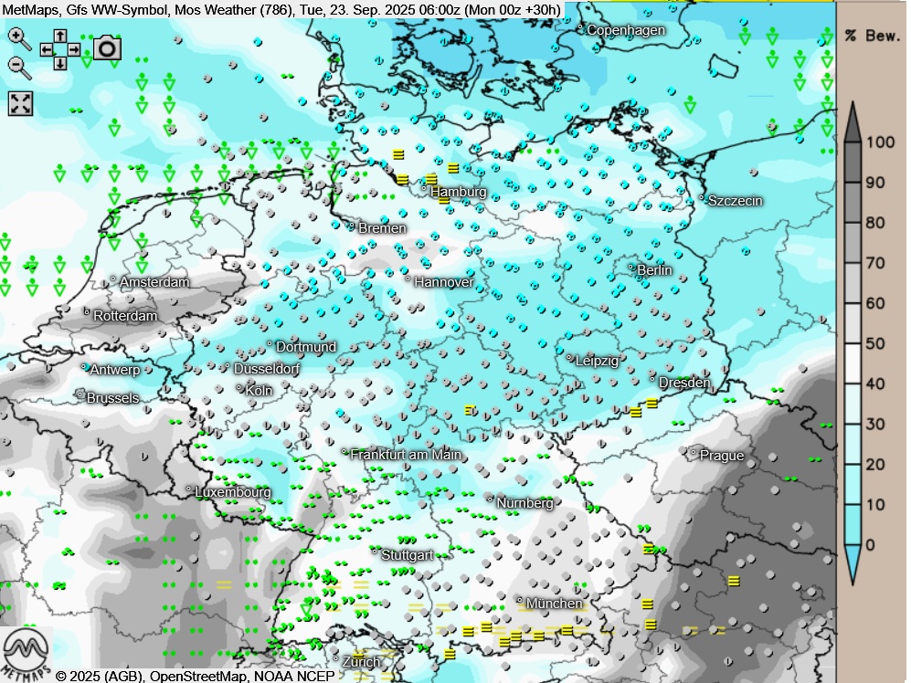 Am Dienstag wechseln sich über der Nordhälfte Deutschlands Sonne und Wolken ab und es bleibt meist trocken. In den restlichen Landesteilen ist es meist stark bewölkt, dabei fällt von Südwesten im Tagesverlauf teils schauerartiger Regen.