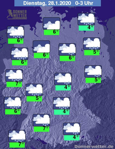 Der Dienstag startet verbreitet mit einer geschlossenen Wolkendecke, dabei muss in weiten Landesteilen mit Regen gerechnet werden. In höheren Lagen können die Niederschläge auch als Schneeregen oder Schnee fallen. Es weht ein meist frischer bis stürmischer Wind, im Süden und auf den Gipfeln der Mittelgebirge sind auch Sturmböen oder orkanartige Böen möglich.