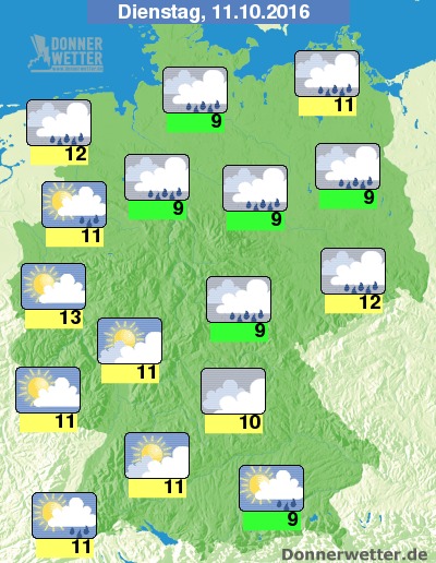 Am Dienstag breiten sich dichte Wolken über die gesamte Nordosthälfte aus und es fällt zeitweise Regen. Im Alpenvorland ist es ebenfalls oft stark bewölkt, dabei bilden sich gebietsweise Schauer. Im übrigen Bundesgebiet ist es teils stark, vor allem nach Westen hin aber auch oft nur locker bewölkt, dabei bleibt es trocken. Es werden herbstliche 9 bis 13 Grad erreicht.