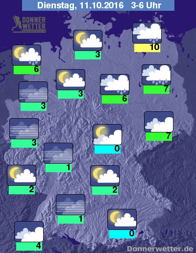 In der folgenden Nacht ziehen im Nordosten und Norden dichte Wolken mit zeitweiligem Regen durch. Weiter nach Südwesten ist es dagegen verbreitet sternenklar oder nur locker bewölkt und dazu auch trocken. Die Temperatur sinkt auf 10 bis 0 Grad. Stellenweise bildet sich Nebel oder Hochnebel, dabei ist teils mit Rauhreif zu rechnen!