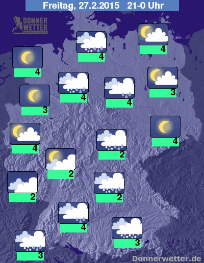 In der Nacht zum Samstag ist es in der Osthälfte des Landes größtenteils stark bewölkt und es fällt gebietsweise Regen, Schneeregen oder Schnee, dazu kann es stellenweise glatt auf den Straßen werden. Im Südwesten ist es ebenfalls meist stark bewölkt, aber hier bleibt es schon weitgehend trocken. Im Norden und Westen der Republik zeigen sich hingegen verbreitet die Sterne und es zieht hier und da leichte Bewölkung durch. Gebietsweise bildet sich jedoch Nebel oder Hochnebel, dazu besteht stellenweise Glättegefahr. Die Tiefstwerte liegen bei 2 Grad in weiten Teilen Berlin-Brandenburgs und bis -2 Grad am Bodensee.