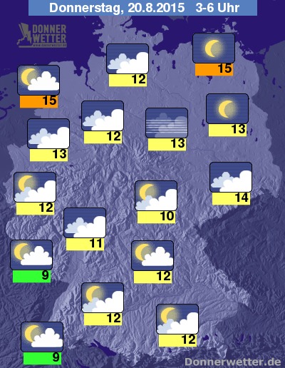In der Nacht auf den Donnerstag zeigt der Himmel einen Wechsel von aufgelockerter und stärkerer Bewölkung an. Besonders im Oberfranken und an der Nordseeküste ist es bedeckt. In Der Sächsischen Schweiz wirds eine nebelige Nacht. Die Luft kühlt sich auf Tiefstemperaturen zwischen 16 Grad C und 10 Grad C ab.