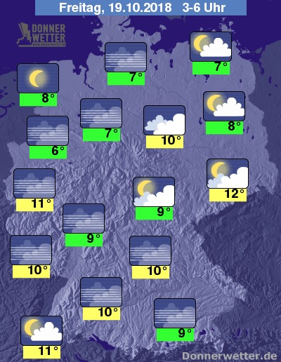 In der Nacht ist der Himmel über der Nordosthälfte überwiegend wechselnd oder stark bewölkt, in den übrigen Landesteilen breitet sich im Nachtverlauf flächendeckend Nebel oder Hochnebel aus. Schauer sind nicht zu erwarten.