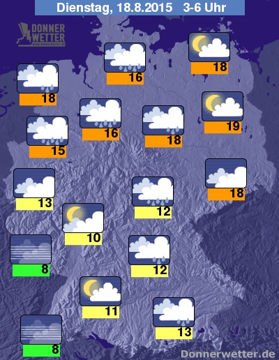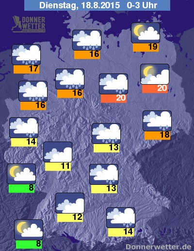 Die Nachtstunden in den Dienstag herein, werden im südwestlichen Teil Deutschlands sehr kühl und bedeckt. In Nordwesten sind immernoch mit schweren Regenfällen zu rechnen. Im Umkreis Köln und im Oberbayern werden Regenwolken in der Nacht vorbeiziehen wodurch die Regenwarscheinlichkeit hoch bleibt. An der Ostseeküste und in Berlin werden es trockene Nachtstunden mit bis zu 18 Grad C in der Innenstadt, und im Saarland sinkt die Temperatur auf kühle 8 Grad C.