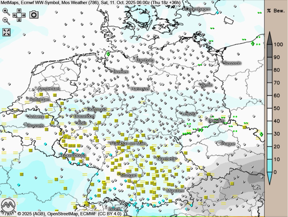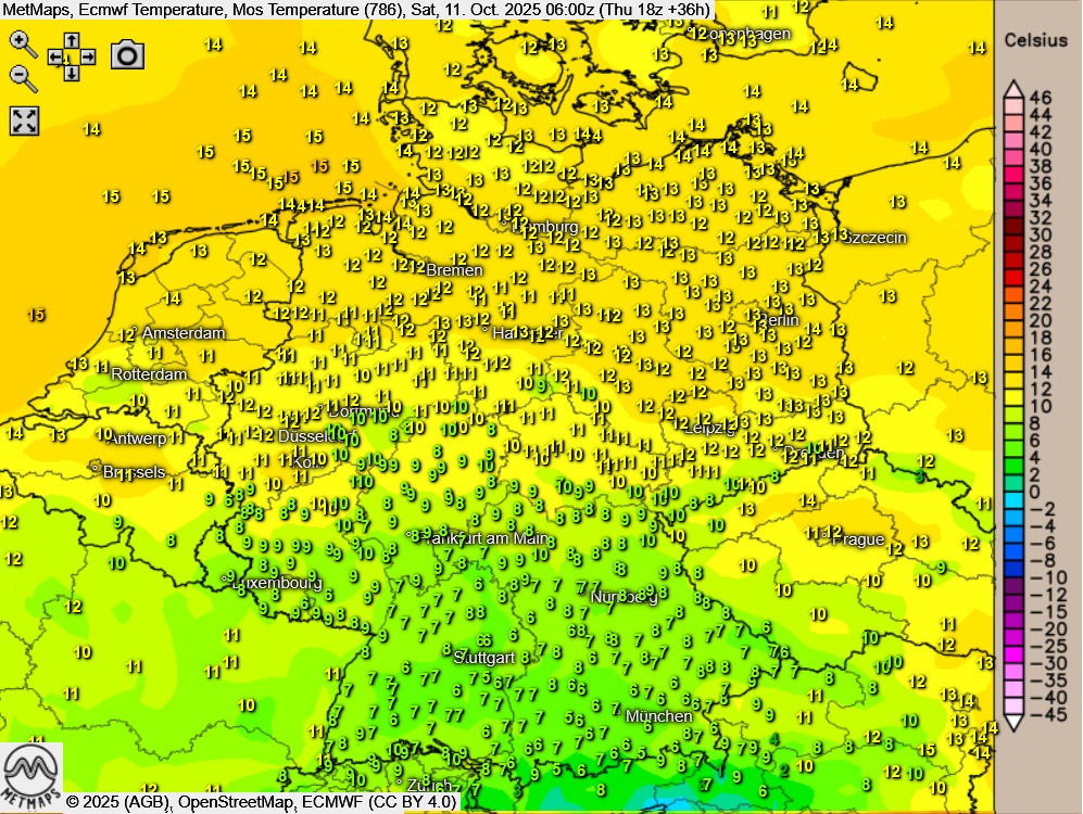 Die Temperatur- und Wetterkarte nach ECMWF für Samstagfrüh (06:00 Uhr):
