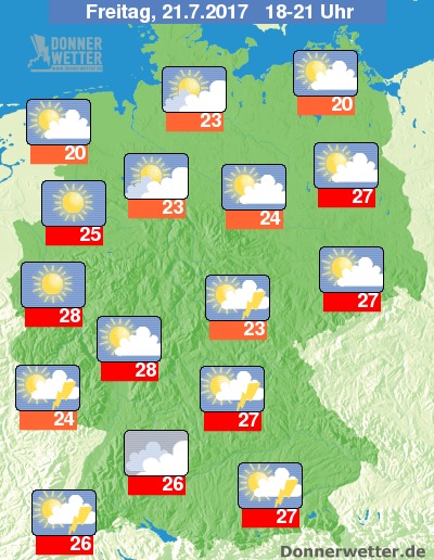 Im Lauf des Nachmittags breiten sich die Gewitter dann über die gesamte Südhälfte des Landes aus, während es im Norden weiterhin recht sonnig bleibt.
