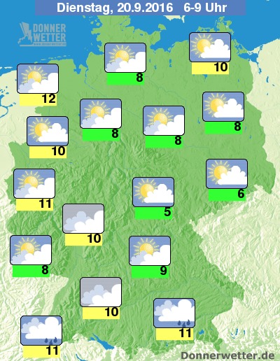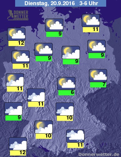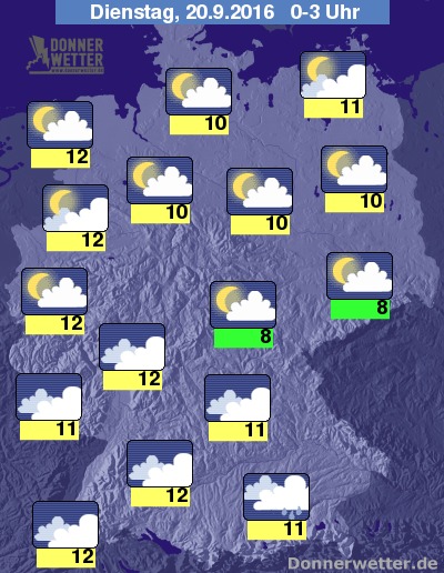 Die Temperaturen sinken in der Nacht auf Werte um 12 Grad C im Emsland und um kühle 6 Grad C im Thüringer Bergland.