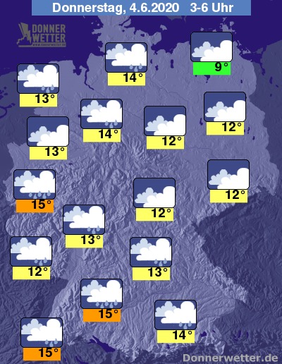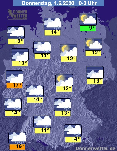 Während der zweiten Nachthälfte fallen die meisten Schauer in sich zusammen, bevor von Südwesten her neue einsetzen. Diese können erneut recht kräftig ausfallen. Lokal werden die Niederschläge auch von Blitz und Donner begleitet.