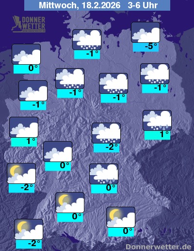 In der Nacht zum Mittwoch zeigt sich der Himmel überwiegend dicht bewölkt, dazu fällt besonders vom Norden und in den Osten und in den Norden Bayerns Schnee, teilweise auch Schneeregen. Im übrigen Bundesgebiet bleibt es meist trocken. Die Tiefstwerte liegen bei 1 Grad in Dresden und bis -5 Grad in Neubrandenburg.