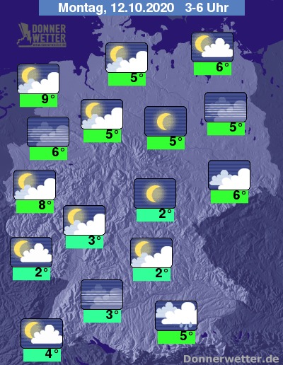 In der folegenden Nacht zeigt sich der Himmel zum Großteil locker bewölkt oder sternenklar. Oft stark bewölkt ist es allerdings über Bayern, Sachsen und der Südosthälfte Brandenburgs. Regen fällt jedoch lediglich noch am Alpenrand. Die Temperatur sinkt auf 9 Grad an der Nordsee und bis etwa 2 Grad im Saargau. Stellenweise sind Nebel und Rauhreif möglich!