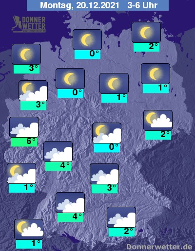 In der folgenden Nacht klart der Himmel zunächst im Norden, im weiteren Verlauf über der Nordhälfte des Landes auf. Weiter nach Süden hin bleibt es bis zum Morgen zumeist stark bewölkt, hier und da und vor allem am Alpenrand lockert der Himmel auf. Es bleibt landesweit trocken. Die Temperatur sinkt auf 6 Grad in Köln und etwa 0 Grad in Hamburg.