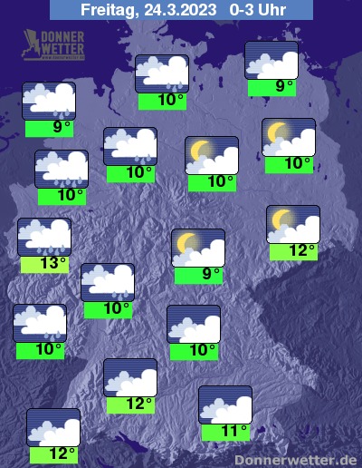 In der Nacht auf Freitag zeigt sich der Himmel meist bedeckt oder es ist stark bewölkt. Von Westen her breiten sich teils schauerartige Regenfälle aus, die im weiteren Verlauf auch die Mitte und den Osten Deutschlands erreichen.