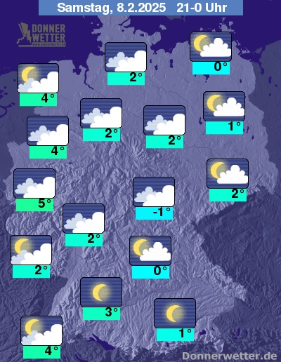 In der Nacht zum Sonntag bleibt es über der Nordwesthälfte stark bewölkt, Niederschläge sind aber nicht zu erwarten. In den übrigen Landesteilen überwiegt geringe Bewölkung, vor allem im Süden und der Mitte kann sich gebietsweise Nebel oder Hochnebel bilden.