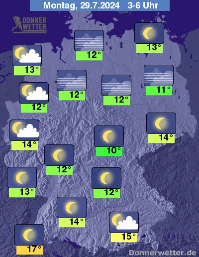 In der Nacht zum Montag ist der Himmel gering bewölkt oder es ist sternenklar, gebietsweise kann sich in den Frühstunden Nebel bilden. Es bleibt trocken.