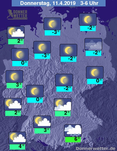 Bis zu den Frühstunden kühlt die Luft im Norden und Osten häufig in den leichten Frostbereich ab, im Süden und Westen bleibt es milder.