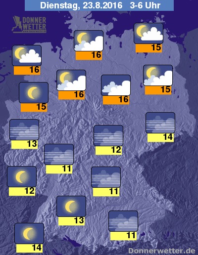 In der Nacht zum Dienstag sind im Norden noch oft dichte Wolken möglich, die hier für möglichen Regen sorgen. Weiter nach Süden hin zeigt sich der Himmel dagegen verbreitet sternenklar, dazu bleibt es trocken. Die Temperatur sinkt auf 16 Grad in Hamburg und bis auf 11 Grad in München.