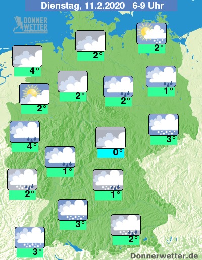 Der Dienstag startet weiterhin stark bewölkt, ein paar Lichtblicke sind in den Frühstunden vor allem an der Ostseeküste und am Niederrhein möglich. Ausgenommen den äußersten Nordwesten muss am Dienstagmorgen verbreitet mit Regen-, Schnee- oder Graupelschauern gerechnet werden, im Bergland fällt durchgängig Schnee. Der Westwind weht meist stürmisch, in Schauern sind verbreitet auch Sturmböen möglich.