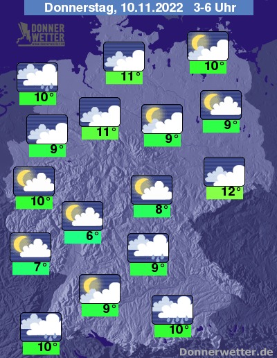 In der Nacht zum Donnerstag fällt im Süden unter dichten Wolken verbreitet Regen. Nördlich des Mains ist es zeitweise nur leicht, häufig aber auch stark bewölkt. Lediglich im Nordseeumfeld bilden sich örtliche Schauer, sonst bleibt es weitgehend trocken. Die Temperatur sinkt auf 12 Grad in der Lausitz und etwa 6 Grad am Westerwald.