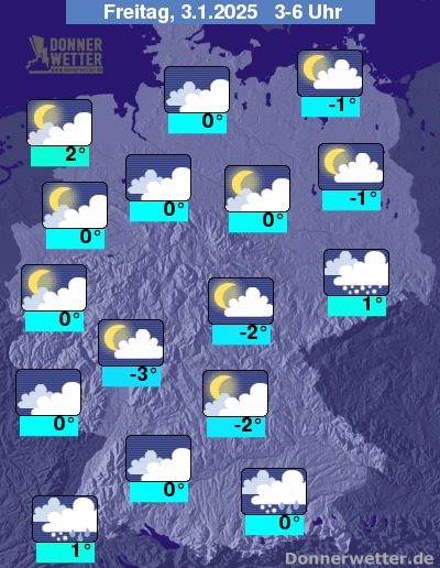 In der Nacht zum Freitag fällt im Alpenvorland unter dichten Wolken noch zeitweise Regen, Schneeregen oder Schnee. Im übrigen Süden ist es stark bewölkt, aber meist trocken. Von der Breiten Landesmitte bis nach Norden ist der Himmel häufig aufgelockert, gebietsweise aber auch stark bewölkt, dazu ist nur selten etwas Schneefall möglich. Die Temperatur sinkt auf 2 Grad an der Nordsee und bis -3 Grad am Taunus.
