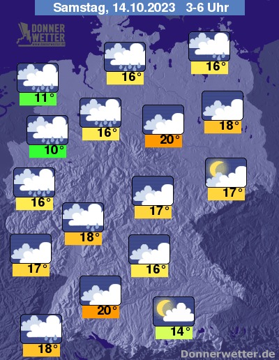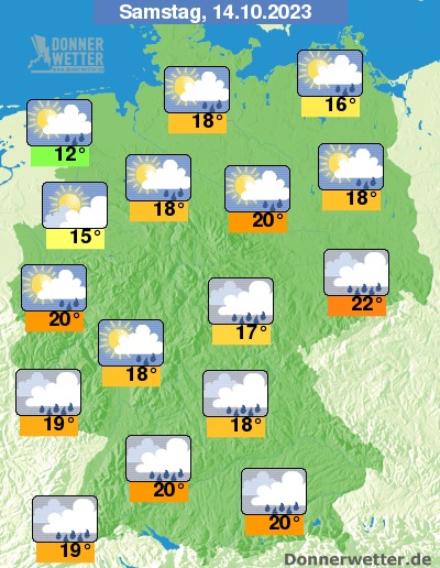 Am Samstag bleibt es im Süden meist stark bewölkt, dabei bilden sich zeitweise Schauer. Ansonsten ist es aber auch oft heiter, teils ziehen dichte Wolken durch, dabei bilden sich einzelne Schauer. Die Temperatur steigt auf 12 Grad in Wilhelmshaven und bis 22 Grad in Dresden. Im Norden weht oft starker Wind. An der See herrscht zum Teil schwerer Sturm.
