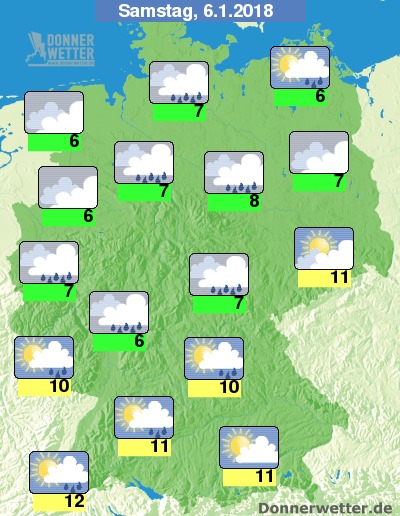 Am Samstag halten sich überwiegend dichte Wolken aus denen auch zeitweise Regen fällt. Im Süden und auch über Sachsen zeigt sich hingegen im Tagesverlauf häufig die Sonne und es ziehen hier mehrheitlich nur lockere bis aufgelockerte Wolken durch, dazu bleibt es auch meist trocken. Die Temperatur erreicht 6 bis 12 Grad.